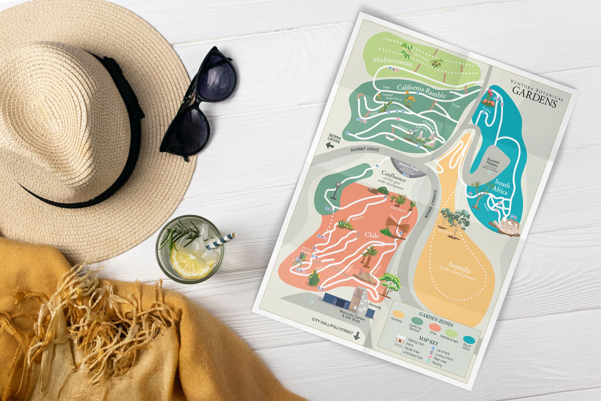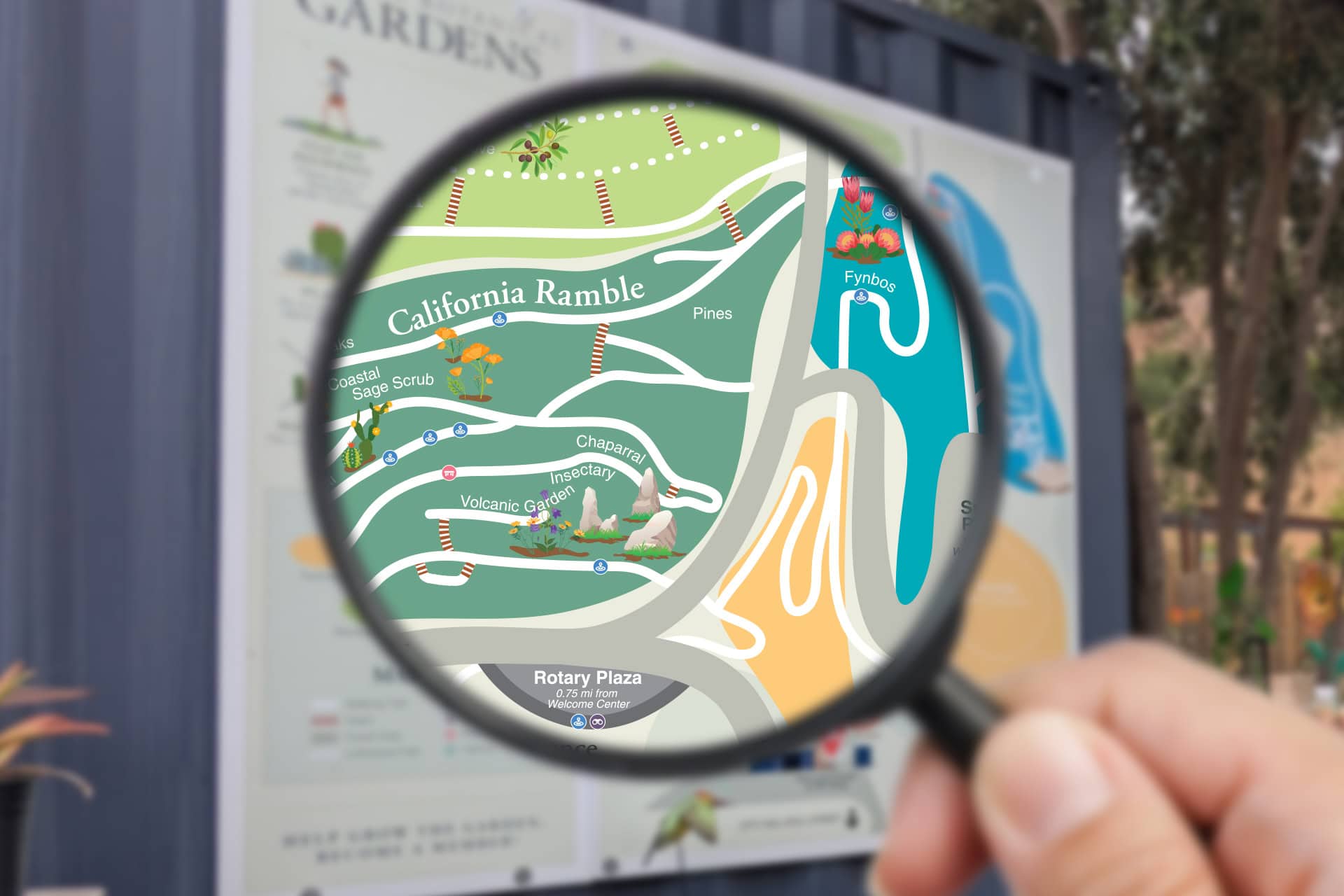 This custom illustrated wayfinding map for the Ventura Botanical Gardens was designed to make exploration effortless and enjoyable, whether visitors are strolling the trails or planning their route ahead of time. Featuring bold color-coded garden zones, clear trail paths, and intuitive icons for photo stops, benches, landmarks, and amenities, the map provides a friendly visual guide to the entire hillside. Installed in three prominent locations throughout the gardens—each with a “You Are Here” marker—it helps guests orient themselves instantly at any point along their visit. For added convenience, the map is also available online as a printable and mobile download version, allowing visitors to navigate the gardens right from their phones or plan at home.